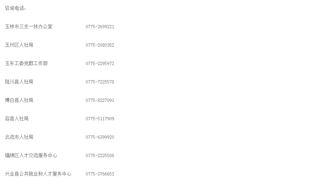 具體事宜可進(jìn)入廣西高校畢業(yè)生“三支一扶”服務(wù)網(wǎng)(http://szyf.gxrc.com)查詢政策或向玉林市“三支一扶”辦公室電話咨詢。