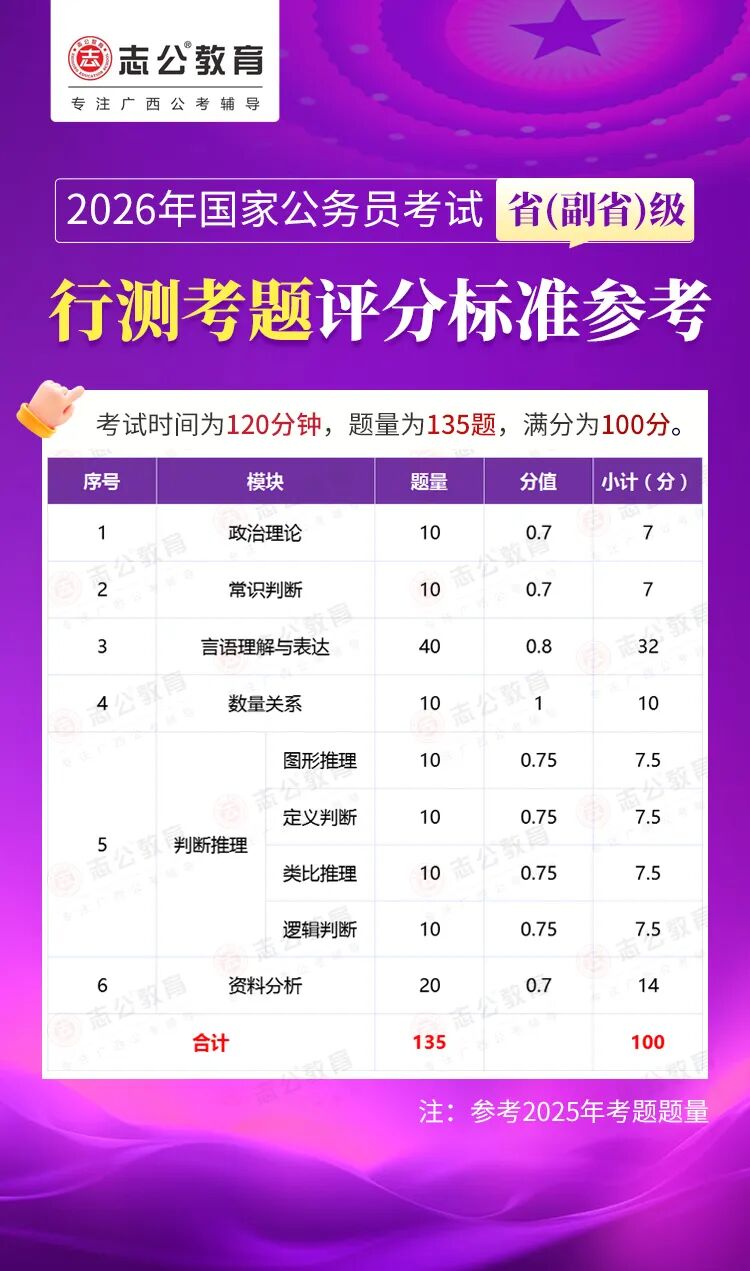 無論報名人數(shù)是否會增加,提升自身實力才是應(yīng)對2026年國考的關(guān)鍵。行測作為國考公共科目筆試的核心模塊,不僅分值占比高(通常為 100 分),更是考生之間拉開分差的關(guān)鍵戰(zhàn)場。它并非單純考查知識儲備,而是通過言語理解、判斷推理、數(shù)量關(guān)系、資料分析、常識判斷、政治理論六大板塊,綜合評估考生的信息處理速度、邏輯思維能力、應(yīng)急決策水平等綜合素質(zhì)。