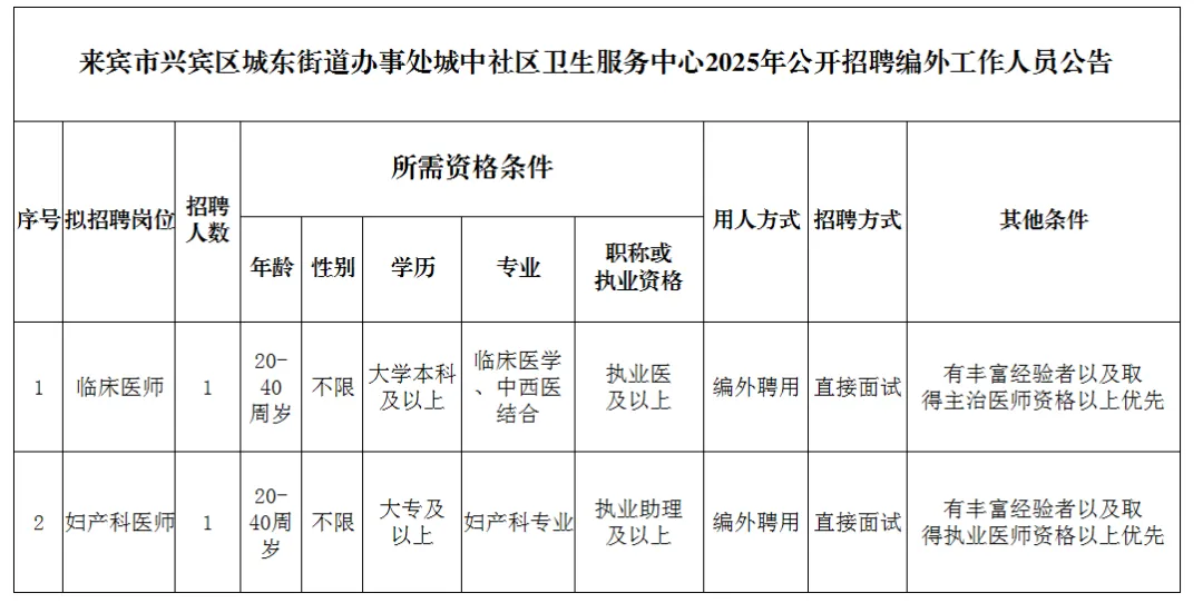 2025年來(lái)賓市興賓區(qū)城中社區(qū)衛(wèi)生服務(wù)中心公開招聘編外工作人員公告