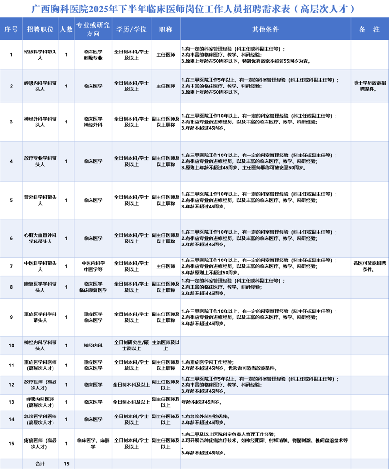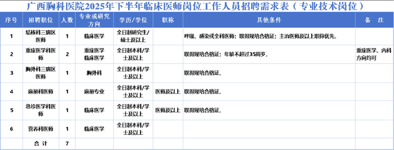 2025年廣西胸科醫(yī)院下半年臨床醫(yī)師崗位工作人員招聘22人