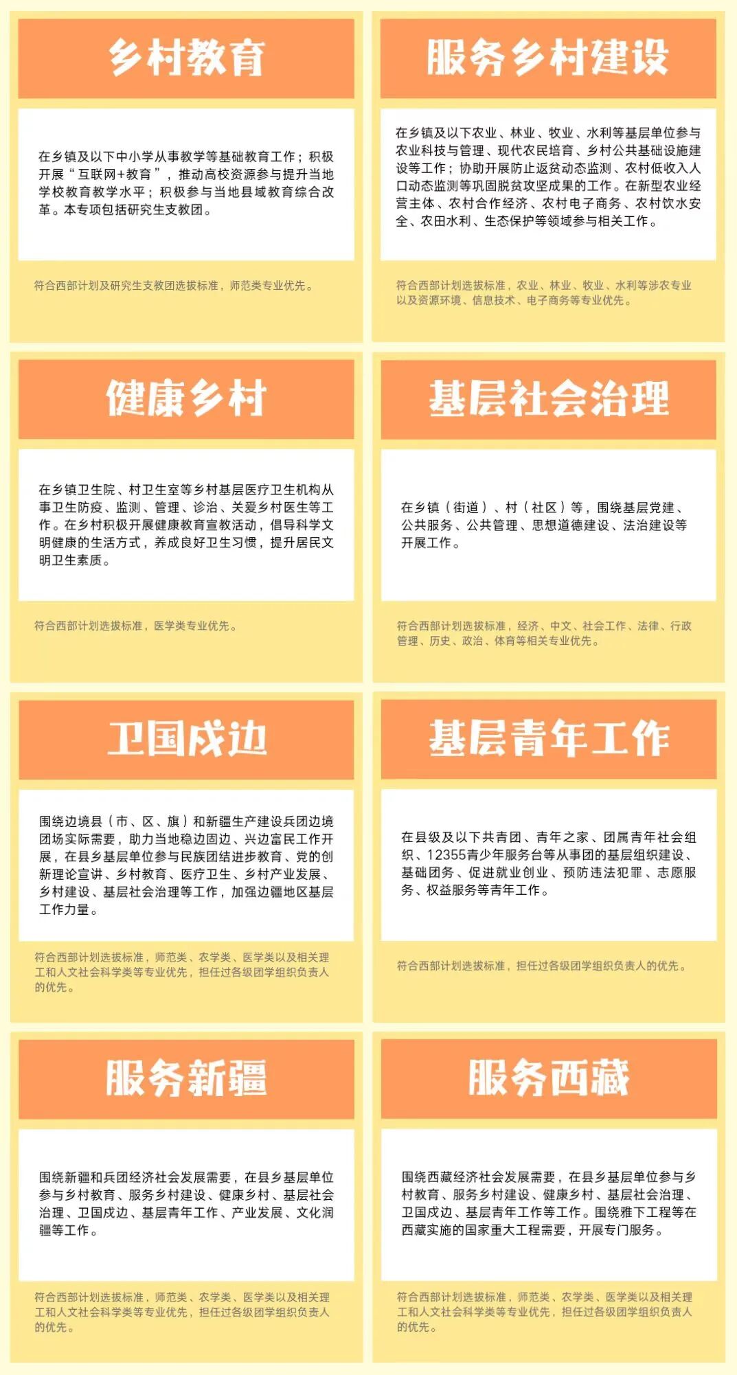 2026年西部計劃項目將深入貫徹落實習近平總書記重要回信精神,引導廣大高校畢業(yè)生積極參加鄉(xiāng)村教育、服務鄉(xiāng)村建設、健康鄉(xiāng)村、基層社會治理、衛(wèi)國戍邊、基層青年工作、服務新疆、服務西藏等8個專項,以青春力量服務國家戰(zhàn)略、服務百姓民生、服務社會治理。今年全國預計新招募約6萬人,赴新疆、西藏等27個省(自治區(qū)、直轄市)和新疆生產(chǎn)建設兵團的基層一線開展志愿服務,90%以上的服務崗位在鄉(xiāng)鎮(zhèn)及以下。西部計劃志愿者服務期為1至3年,服務協(xié)議一年一簽。為激勵志愿者服務期滿繼續(xù)扎根西部、扎根基層,國家在升學、就業(yè)、培養(yǎng)等多個方面給予政策支持。